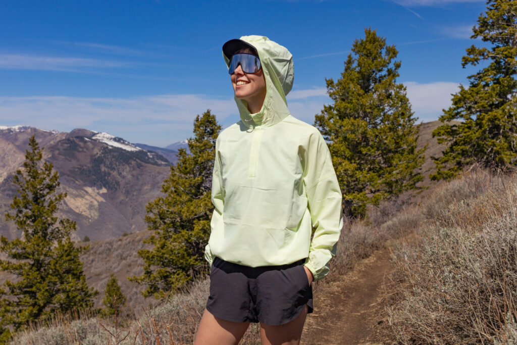 As for other features, I was a fan of all of them. A 1/4 zip made it easy to get off and on (good, since there’s limited stretch in the fabric) and offered additional venting on extra warm days. An adjustable bungee in the hem meant I could wear it loose and open at a slightly cropped length for breathability (the men’s version isn’t cropped) or cinch it for extra insect protection or for cropped styling. Those with lots of hair rejoice: the hood was plenty roomy for curls or ponytails. I don’t have much hair, but I was able to pull the front of the hood over the brim of my hiking hat, which kept it firmly in place during wind gusts.